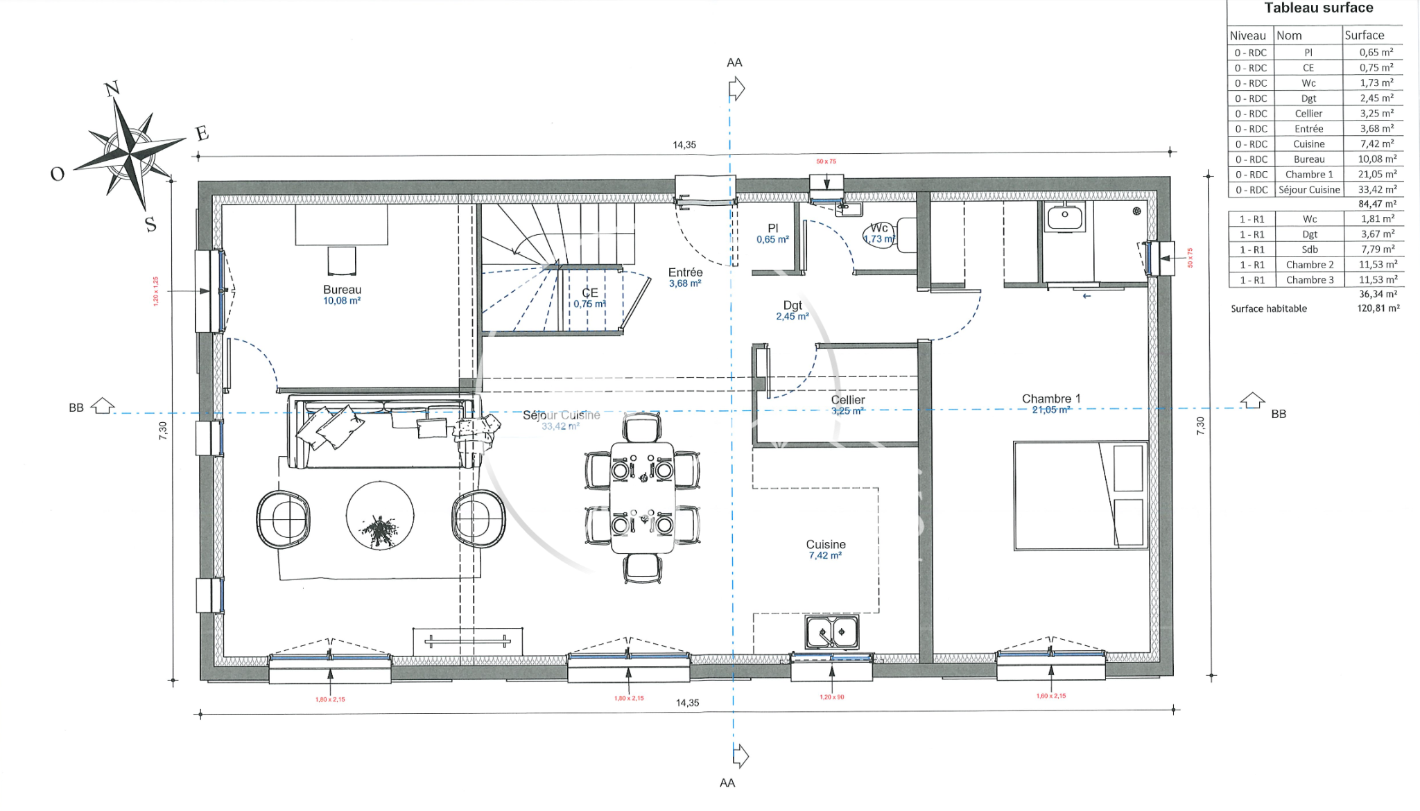 - au rez-de-chaussée : séjour / cuisine ouverte de 33m2, une suite parentale (chambre + salle d'eau), un WC séparé, un cellier et un grand bureau