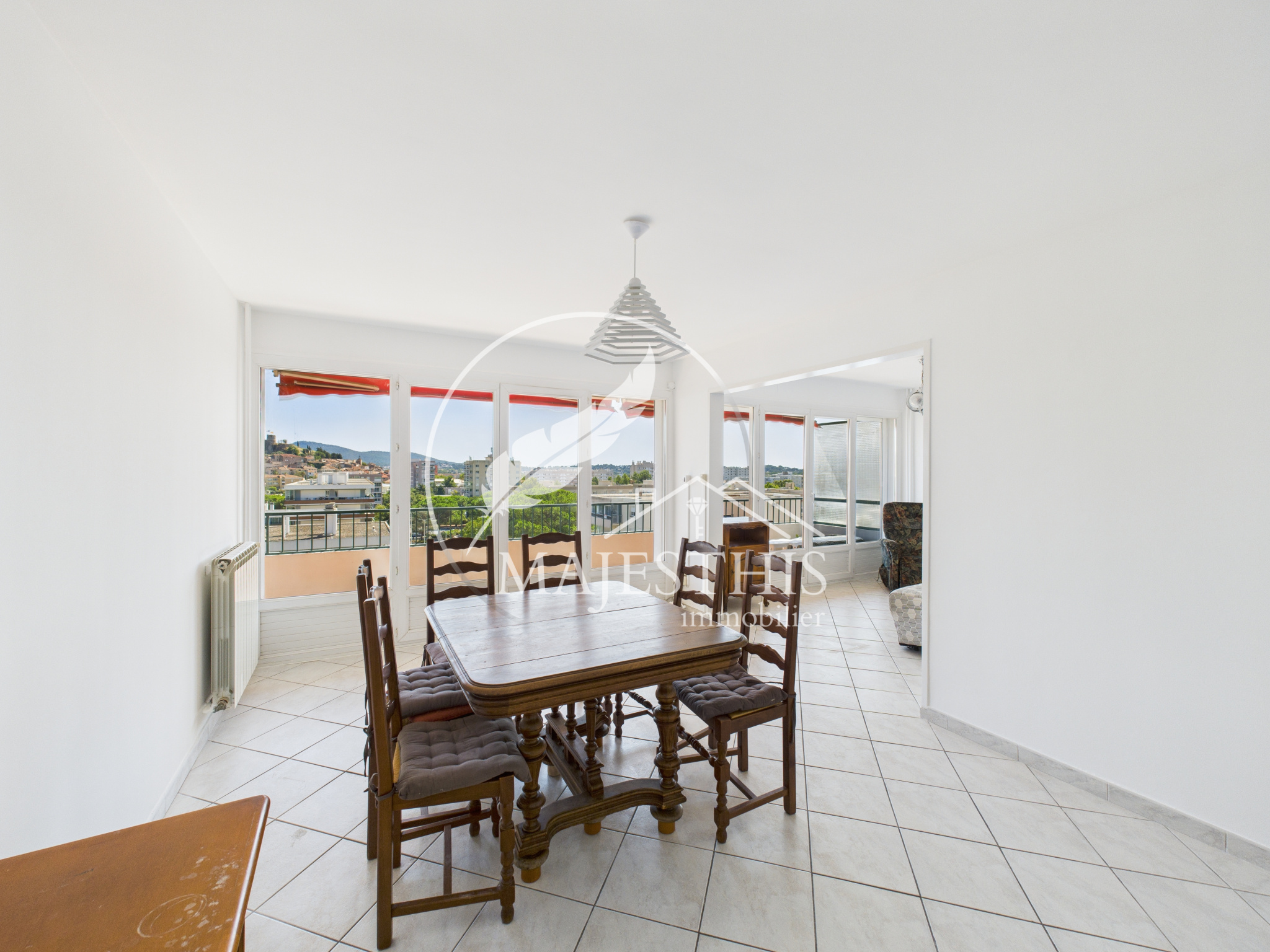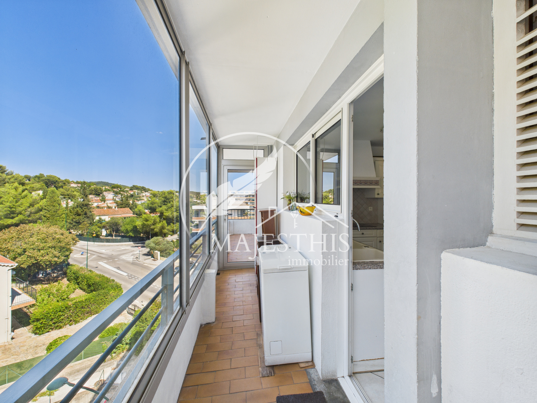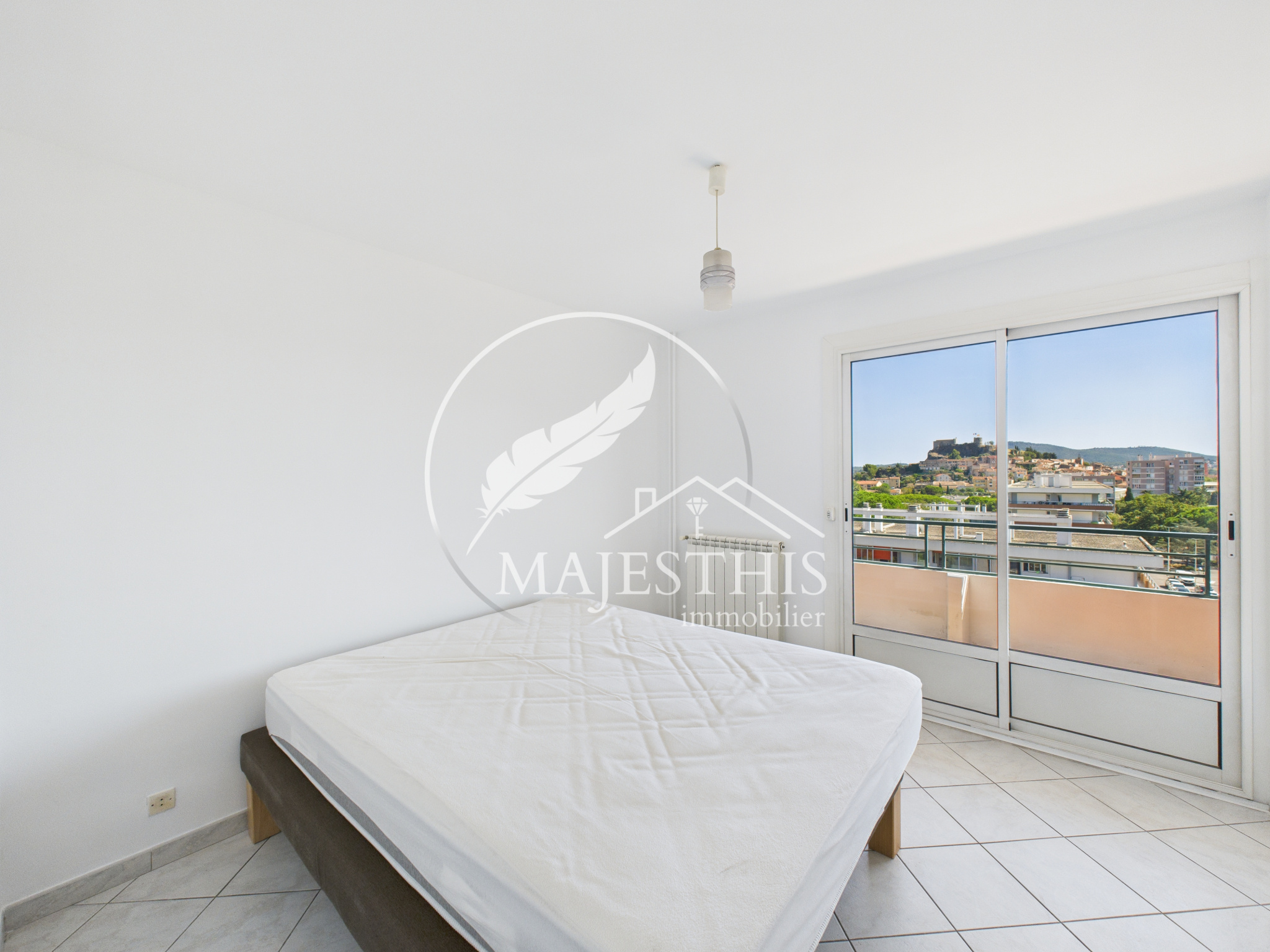 L’appartement se compose d'une entrée, d'un salon-séjour lumineux, donnant accès à la terrasse avec une vue dégagée sur le château de La Garde. La cuisine séparée s’accompagne d’une loggia et d’un cellier.