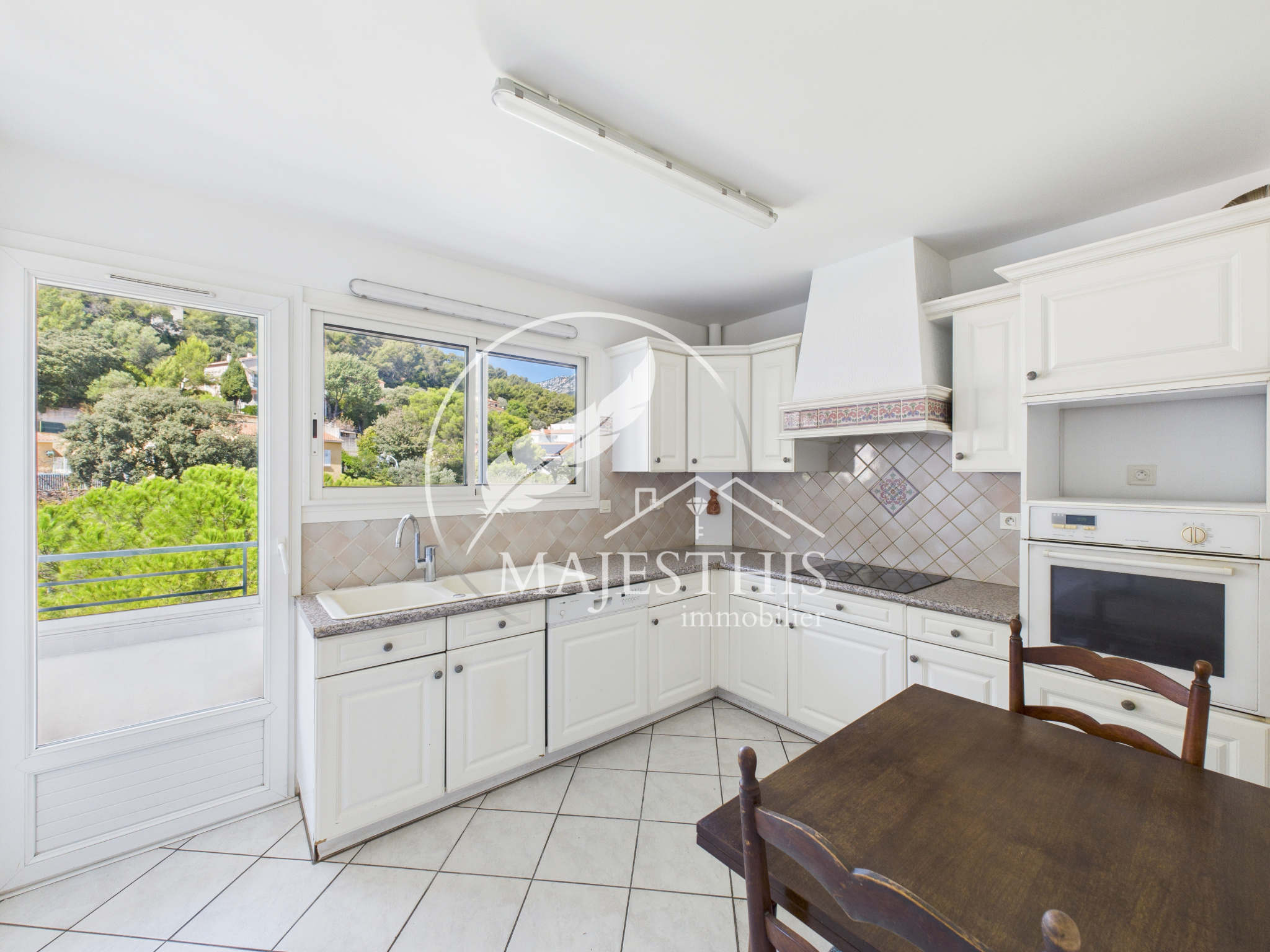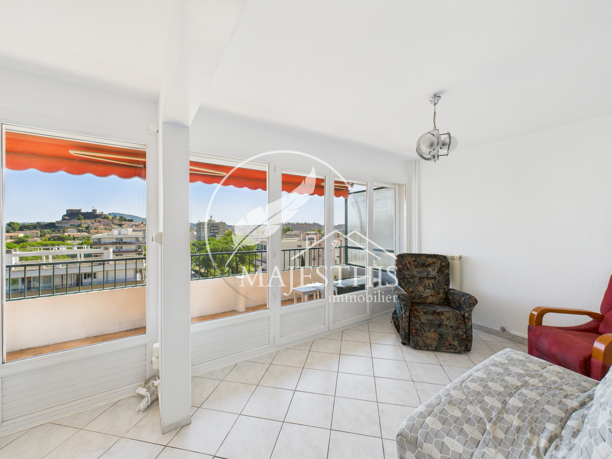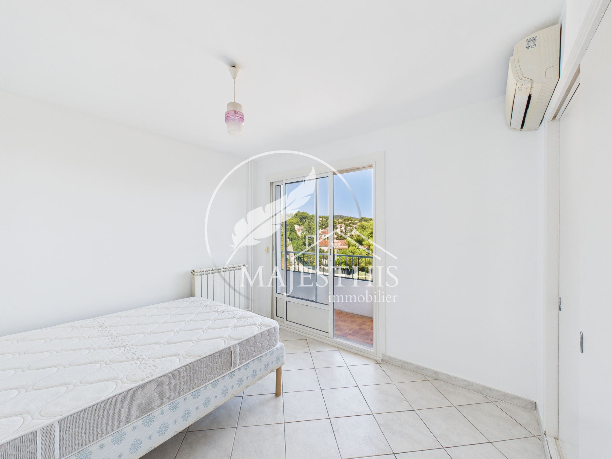 L’appartement se compose d'une entrée, d'un salon-séjour lumineux, donnant accès à la terrasse avec une vue dégagée sur le château de La Garde. La cuisine séparée s’accompagne d’une loggia et d’un cellier.