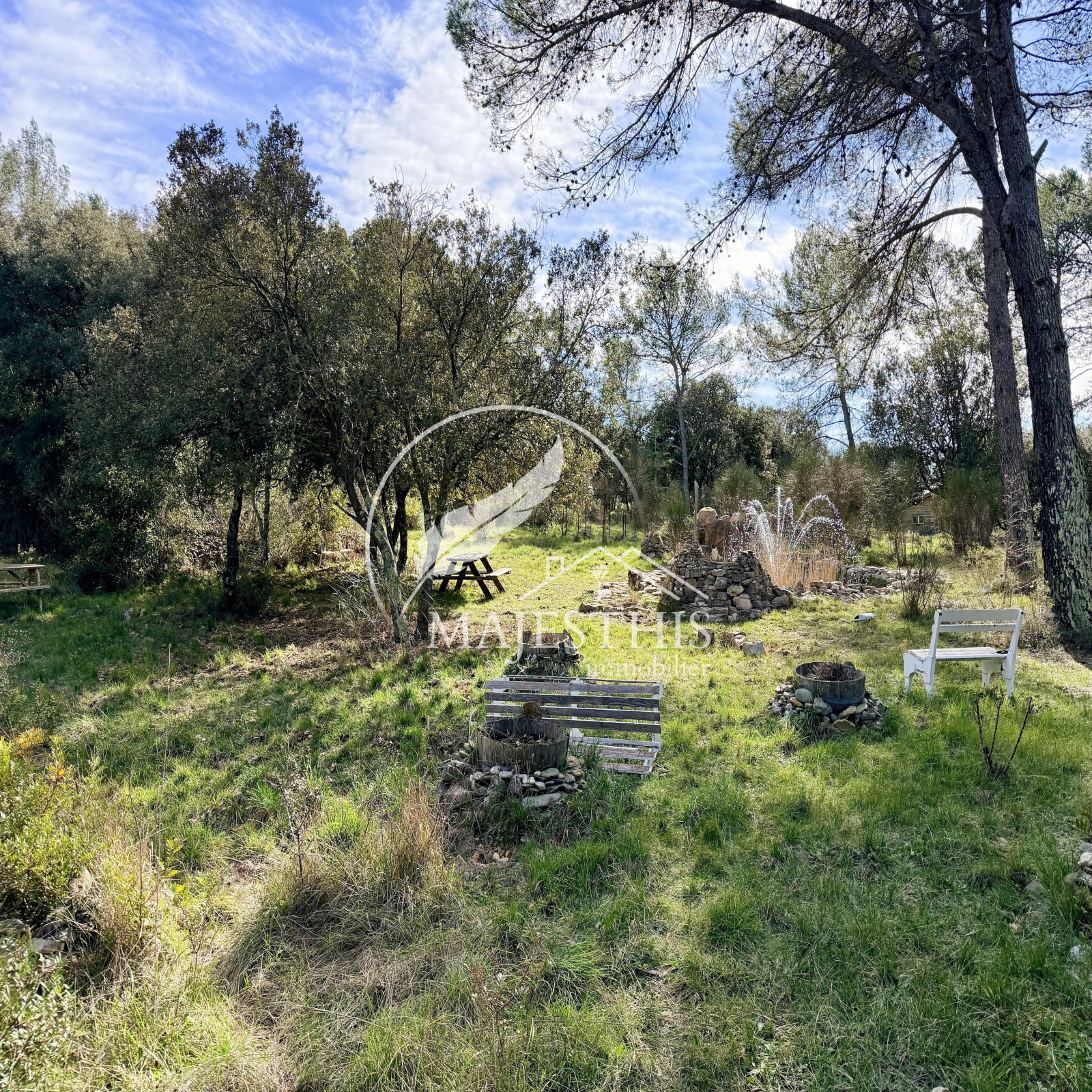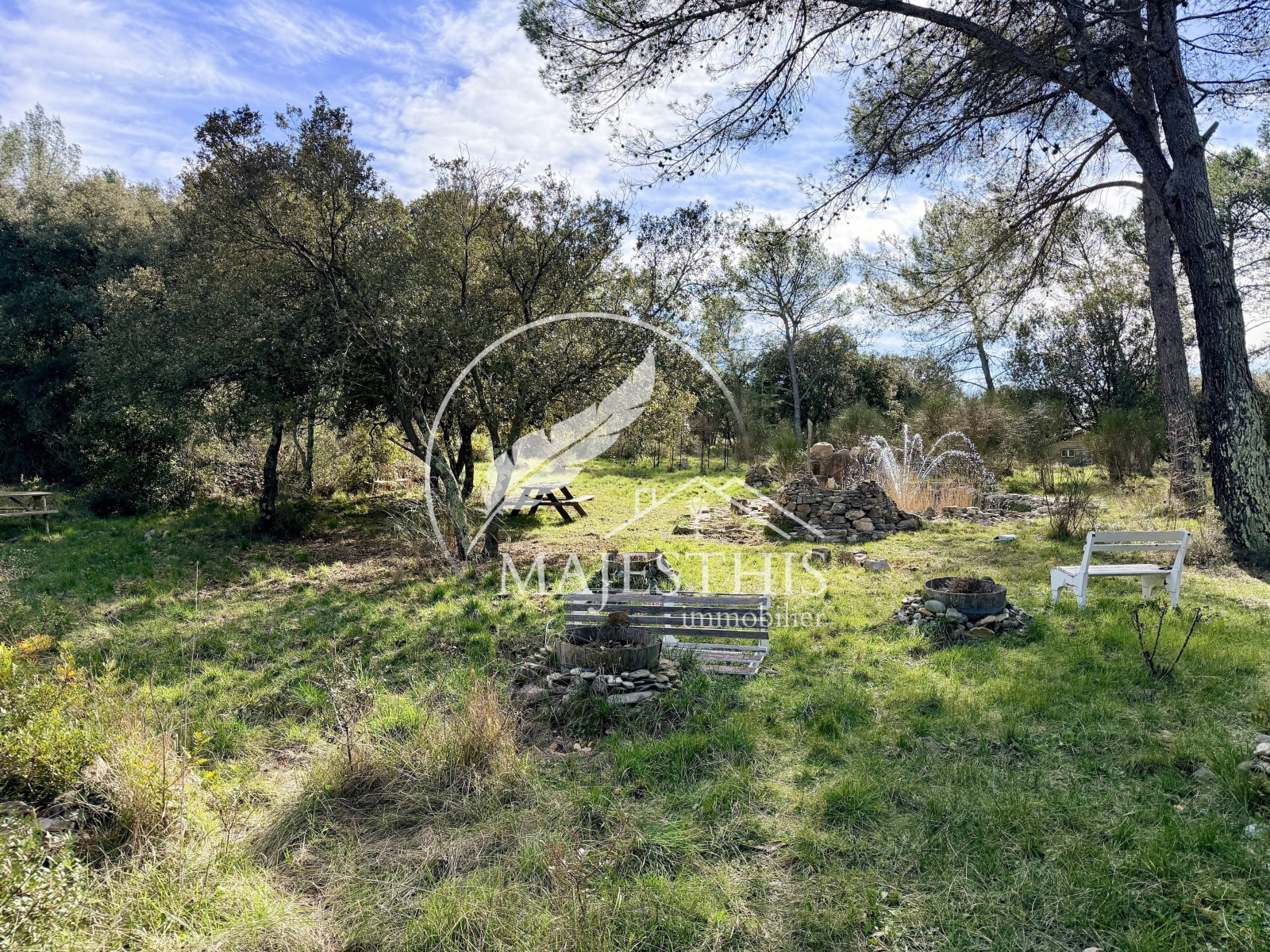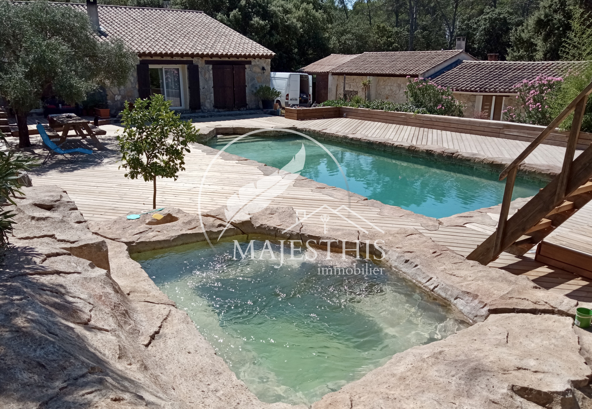 La parcelle offre de nombreuses possibilités d’aménagement. Un forage alimente l’ensemble des habitations, le jardin et la piscine. Bassin, cabanon, terrain de badminton et boulodrome viennent compléter l’ensemble.